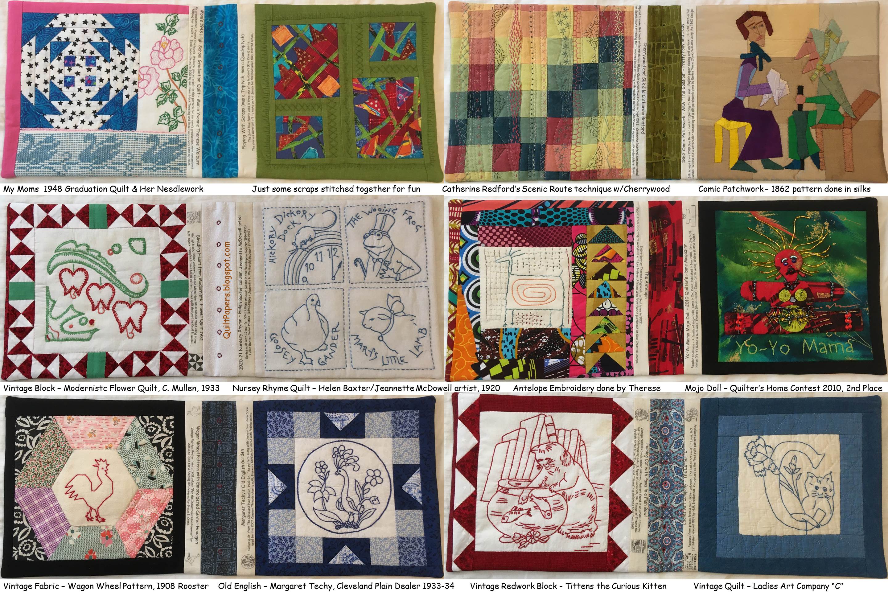 Finished quilt: 72 x 91 [Versus 78 by 98 given in the pattern]Predominant Color(s): Red; Blue; Green; [and yellow]Block pattern: 16 patch; Number of quilt blocks: 48Size of quilt blocks: 8 inches; Sashing width: 2 inchesQuilt maker's name: Palmer, Louella Starr StalkerWhere the quilt was made, Collinsville, OK